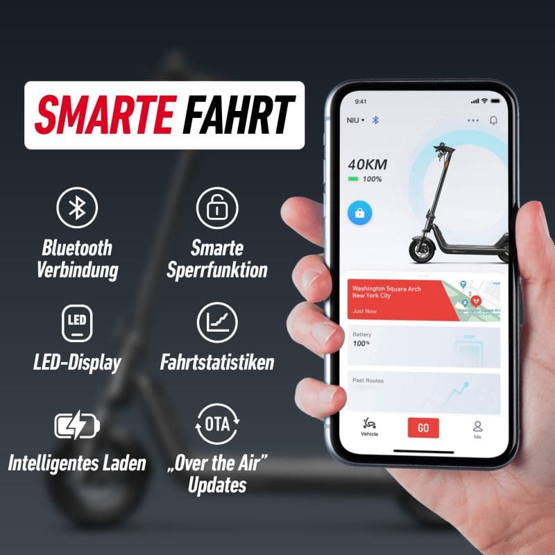 Voll vernetzt 📱: Verbinde deinen Scooter per Bluetooth mit der NIU App für smarte Features wie Diebstahlschutz und Fahrmodus-Anpassungen.